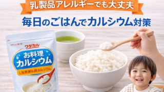 乳製品アレルギーの4歳息子のカルシウム不足が心配で、ワダカルお料理カルシウムを試しました。お米やお茶に入れてみた感想、子どもの反応、1日のカルシウム摂取量について実体験をもとに紹介します。