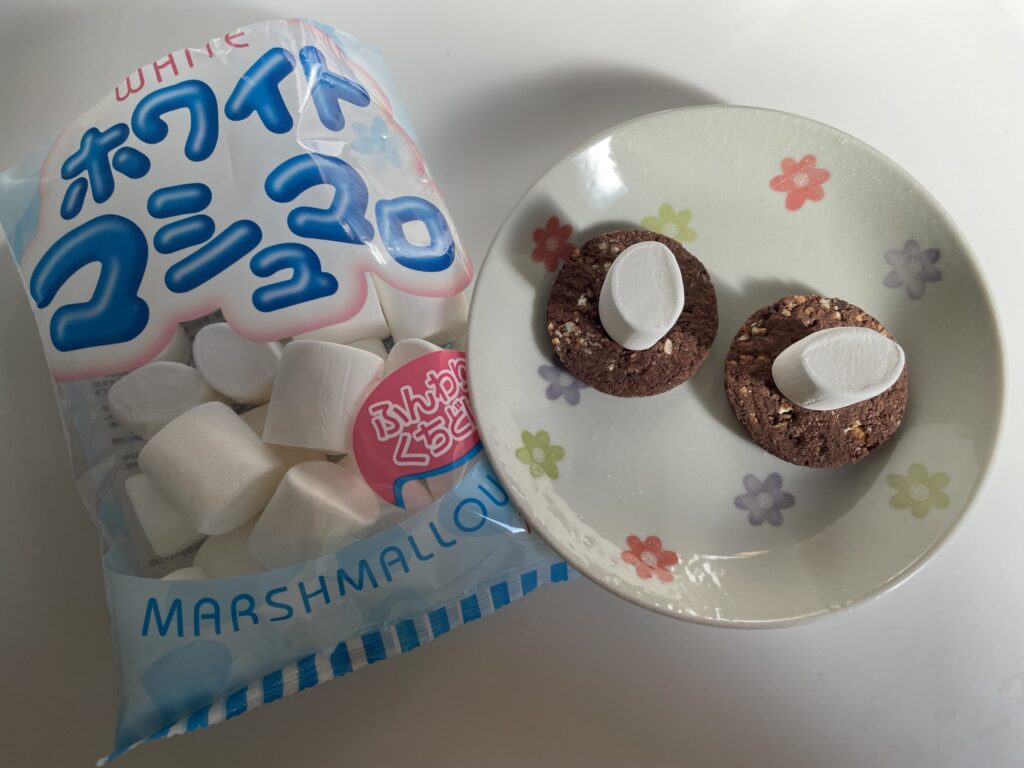 - 市販の卵・乳不使用マシュマロをビスケットの上に置く